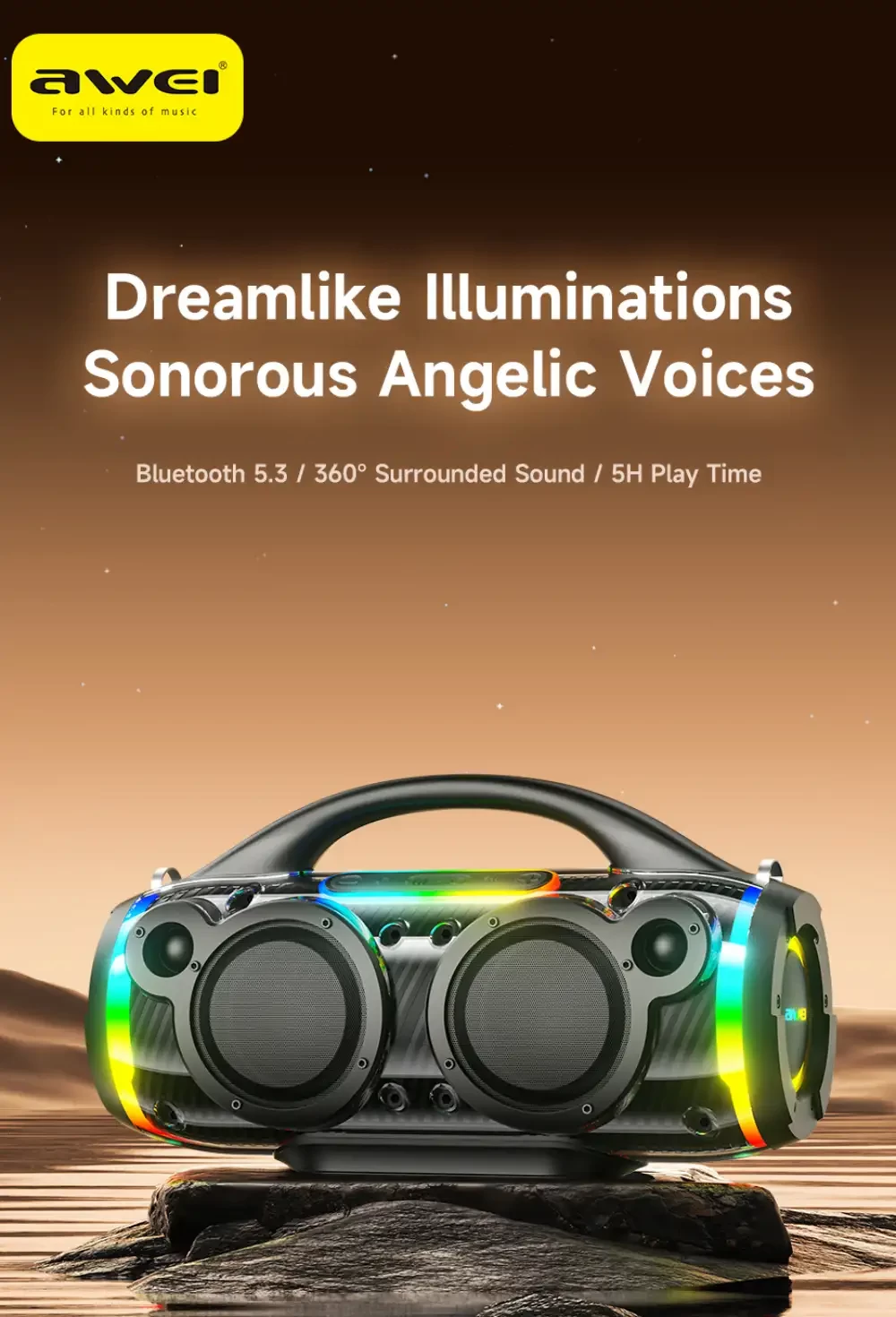• Long-Lasting Battery & Portable Design: Featuring a 4000mAh (7.4V) battery, the AWEI KA12 provides 4-5 hours of playback at 70% volume. It takes 5 hours to fully charge via Micro USB (DC 5V). The compact and durable design (350x140x200mm) makes it ideal for outdoor adventures.