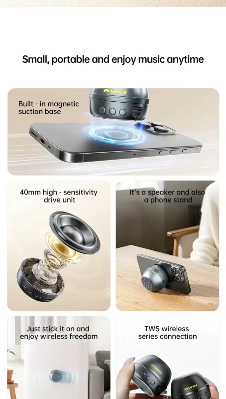 Magnetic Suction Module: Stick the speaker securely to any metal surface—fridge, locker, or car—for instant, space-saving audio.