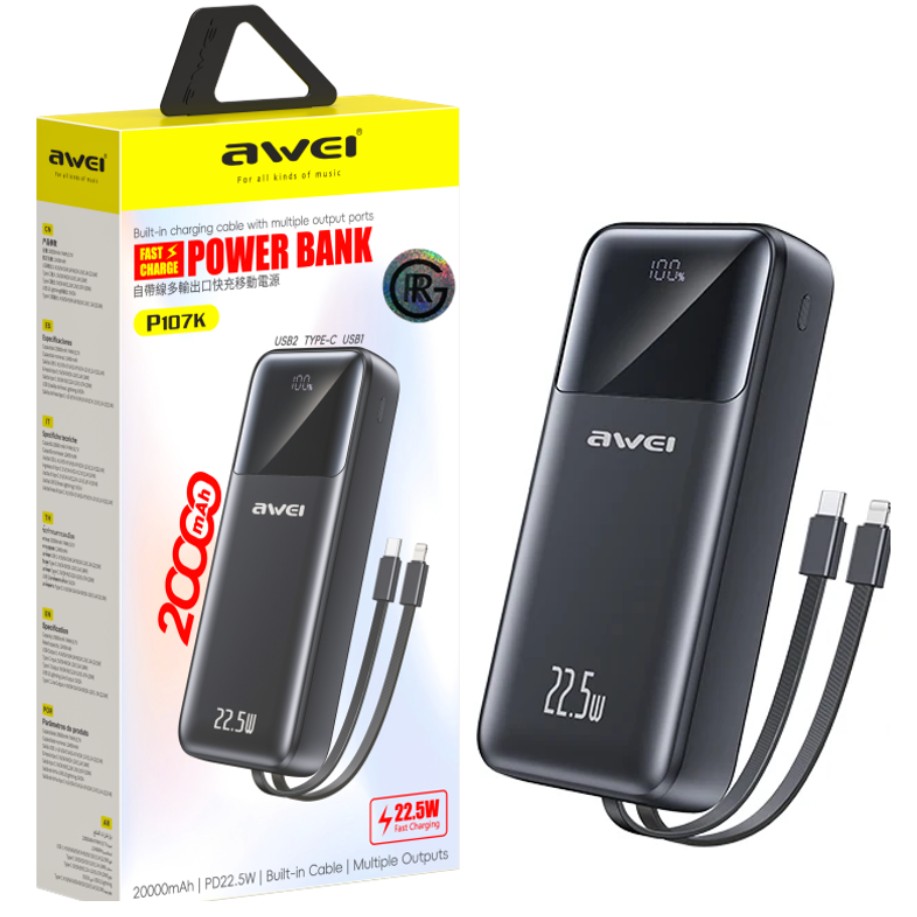 • The Awei P107K 20000mAh 22.5W Fast Charging Digital Display Power Bank is an excellent companion for those constantly on the move. With its large 20000mAh capacity, it provides plenty of power to keep your devices charged throughout the day. Moreover, its high-speed charging capability, with a maximum output of 22.5W, ensures that your devices will charge efficiently. Whether you need to power up your phone, tablet, or other gadgets, this power bank offers reliable performance.