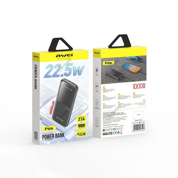 Charge your smartphone and other peripherals smartly with the P10K 22.5W power bank from Awei. Comes with a lightweight profile to handle easily while charging your devices. Stay aware of your remaining power backup with the digital display that shows the proper battery left. Large battery capacity inside to charge up to three devices simultaneously. Multiple charging solutions to devices, earbuds and even smart watches to smoothly deliver power. Maximum of 22.5W output from USB-A port to swiftly charge your early power needed devices. Slimmer profile of the P10K power bank gives you easy portability while you roam around and carry in your pocket.