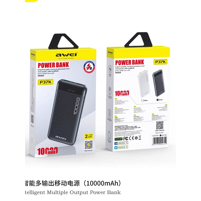 The Awei P37K 10000mAh Fast Charging Power Bank boasts a built-in smart chip, ensuring wide compatibility with popular mobile phone brands like Huawei, Xiaomi, Samsung, and Oppo. Its high-powered DC5v/2.1A output guarantees rapid charging, making it ideal for day-long use during work or travel. With a substantial 10,000mAh battery capacity and dual outputs and inputs, it delivers convenience and efficiency. The power bank meets international air transport standards, allowing for hassle-free portability. The multiple output modes cater to various mobile devices, ensuring fast and comfortable charging on the go. The Awei P37K include a capacity of 10000mAh (37Wh/3.7V), a rated capacity of 6200mAh, dual USB outputs, and versatile Type-C/Micro inputs. Designed for swift and reliable charging, the Awei P37K is a powerful companion for all your mobile devices.
