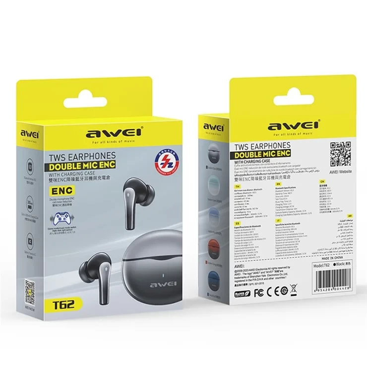 Remain stylish while listening to quality music with the Awei T62 ENC Earbuds. Comes with a glossy design for the earbuds and colorful gradients for user’s who love fashion. Listen to quality audio from the dynamic 10mm driver delivering HiFi stereo with deeper bass for an immersive audio experience. Enjoy crystal-clear calls and immersive music with environmental noise cancellation. Stay connected even in crowded environments with stable transmission technology. With Bluetooth 5.3 connectivity, enjoy stable connections up to 15 meters away. Decent amount of 300mAh battery offers up to 20 hours of playtime, easily recharged in just 1.5 hours via Type-C interface. Choose from vibrant colors including black, blue, green, and more. With a low latency of 65ms, gamers can enjoy lag-free gaming sessions. Comfortable ergonomic design ensures long-lasting wear during workouts or extended listening sessions. Lightweight build quality gives you easier wearing for longer hours.