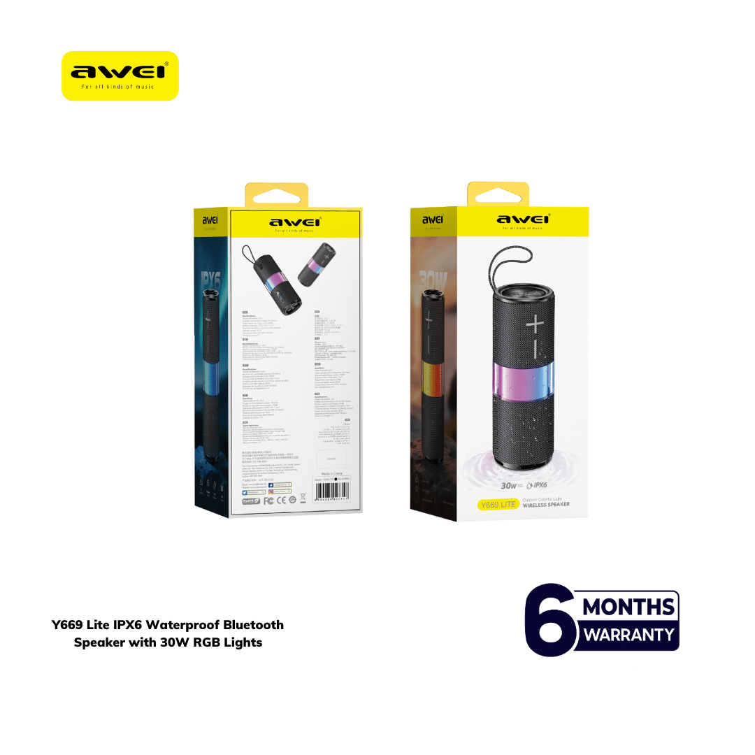 • Awei Y669 Lite Waterproof Bluetooth Speaker 30W is a powerful and portable wireless speaker built for immersive sound, vibrant lighting effects, and reliable outdoor performance—ideal for parties, travel, and everyday entertainment.