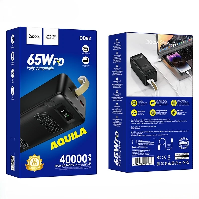 With its super-sized 40000mAh battery, the Hoco DB82 can charge your smartphone multiple times, keep your tablet running for hours, or even provide backup power to laptops and other USB-C devices. It’s perfect for long journeys, outdoor adventures, business trips, and emergency use.