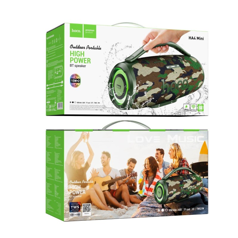 Looking for a portable speaker which has amazing battery life and immersive sound quality? Get Hoco HA4 Mini Surge Outdoor Wireless Speaker which is designed for seamless connectivity. It features a 4-hour playtime at 80% volume only with a 4-hour charging time, ensuring reliable performance on the go. Not only it have 5.3 Bluetooth support but also its compatible with TF cards, USB flash drives (up to 32GB), AUX, TWS, and FM radio. With 2.4GHz frequency, this speaker is perfect for both indoor and outdoor use, combining style, functionality, and superior sound quality.