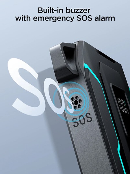 Flashlight & buzzer:Press and hold the button for 3-5s to turn on the strong light mode; short press it again to enter soft light mode; short press it for the 2nd time to enter SOS quick flash mode and the alarm sound will be activated; short press it for the 3rd time to turn off the flashlight. Press and hold the button for 3-5s under any above modes, the flashlight will turn off.