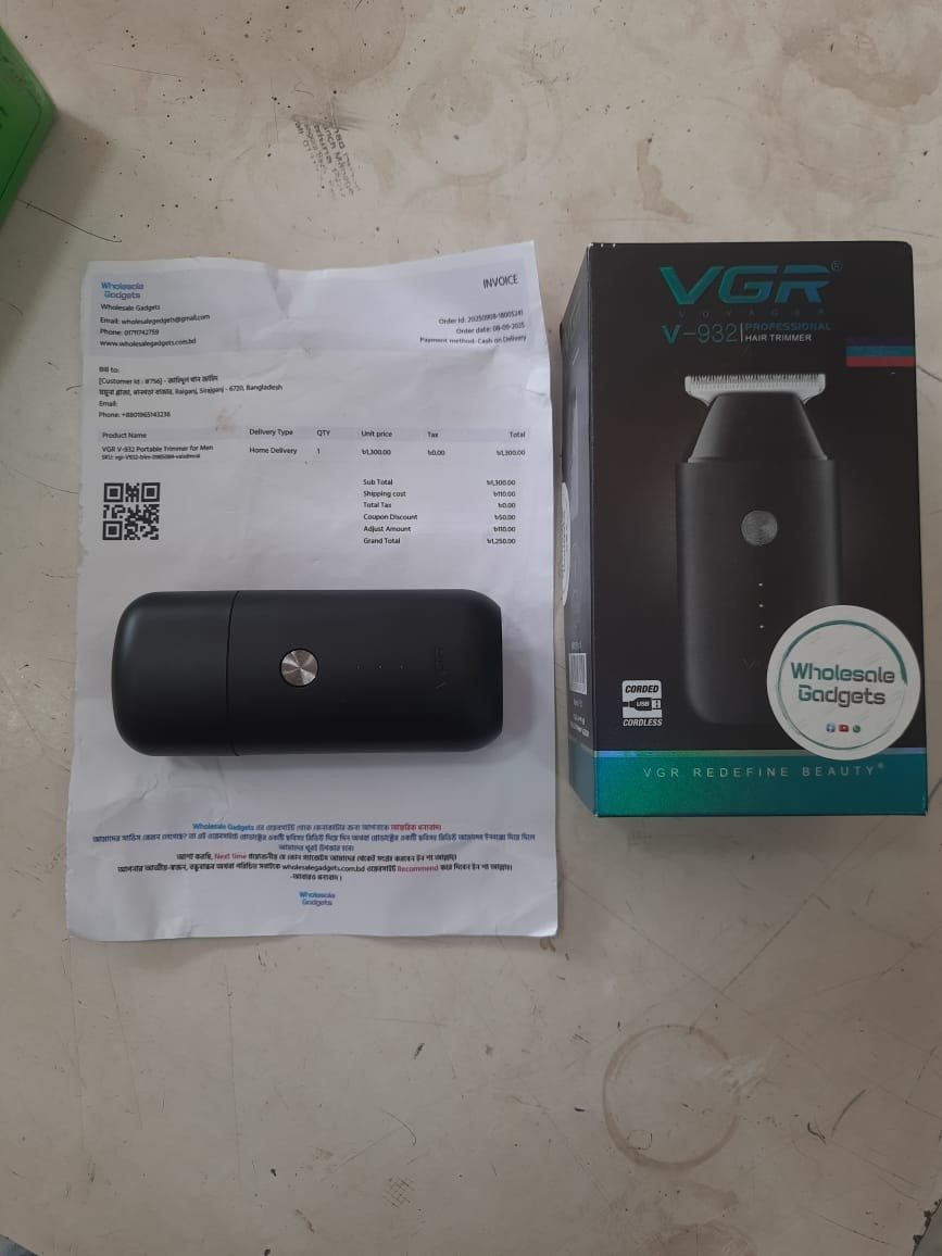 VGR Trimmer V-932 একটি স্টাইলিশ ও হালকা ওজনের ট্রিমার। এতে স্টেইনলেস স্টিল ব্লেড ব্যবহার করা হয়েছে যা ত্বকে স্মুথ ফিনিশ দেয় এবং কাটার সময় টানাটানি হয় না। ব্যাটারির ব্যাকআপ ভালো, একবার চার্জে প্রায় 90 মিনিট পর্যন্ত ব্যবহার করা যায়। এর ডিজাইন গ্রিপ-ফ্রেন্ডলি এবং সহজে হাতে ধরা যায়। চুল, দাড়ি ও মুছ স্টাইলিংয়ের জন্য বেশ কার্যকর। দাম অনুযায়ী এটি একটি ভ্যালু-ফর-মানি ট্রিমার। -জাহিদুল খান, রায়গঞ্জ, সিরাজগঞ্জ।