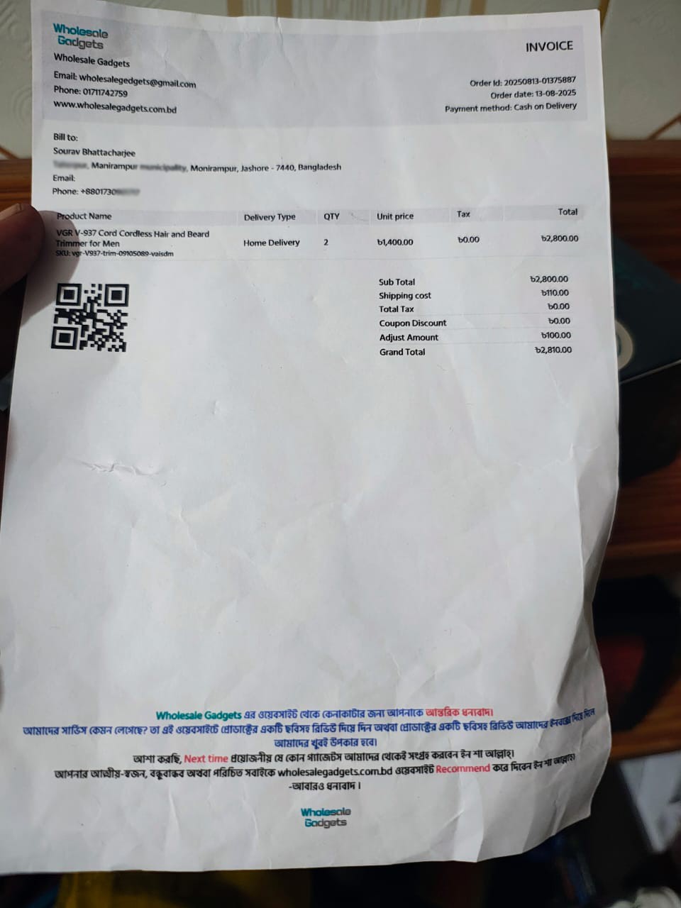 ট্রিমারটির ডিজাইন আধুনিক ও ব্যবহারবান্ধব। এর গ্রিপ বেশ ভালো, ফলে দীর্ঘ সময় ব্যবহারেও হাত পিছলাবে না । মোটর শক্তিশালী এবং লম্বা দাড়ি বা ঘন চুলেও সহজে কাটে, টানাটানি করে না। শব্দ কম, তাই লম্বা সময় ব্যবহার করলেও বিরক্তি লাগছে না। ব্লেড অয়েল প্যাকেটে দেওয়া আছে , আলাদা কিনতে হবে না। যারা ঘরে বসে দাড়ি বা চুল ট্রিম করতে চান, তাদের জন্য VGR V-937 Cord Cordless Hair and Beard Trimmer for Men একটি দারুণ পছন্দ হতে পারে । এটি দিয়ে মাথা মসৃণভাবে টাকও করা যায়। দারুণ লেগেছে ট্রিমারটি । এর কাটিং পারফরম্যান্স, ব্যাটারি ব্যাকআপ এবং বিল্ড কোয়ালিটি—সব দিক থেকেই এটি টাকার যথার্থ মূল্য দেয়। Wholesale Gadgets .com.bd কে অসংখ্য ধন্যবাদ। মাত্র একদিন দিন পরেই ডেলিভারি পেয়েছি। কেনার সময় চ্যাটে রাত- বিরাতে বারবার নক করে জ্বালাতন করার পরেও ওনারা বিরক্তিবোধ করেন নি। আমি যে অভিঙ্গতা পেয়েছি তাতে সবাই এখান থেকে কেনার জন্য সাজেস্ট করছি। - সৌরভ ভট্টাচার্য মনিরামপুর, যশোর।